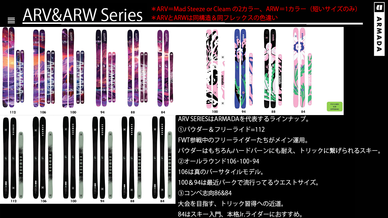 現行のARV&ARWシリーズは今持つ技術、アイデアをつぎ込んだ20年目の集大成でもあります。パウダー&フリーライド、オールラウンド、パークとあらゆるシーンをカバーします。25はARVとARW、計3色展開となり、選択の幅が広がります。スキーの中身は共通ですので性別問わず好きなカラーをお選びいただけます。